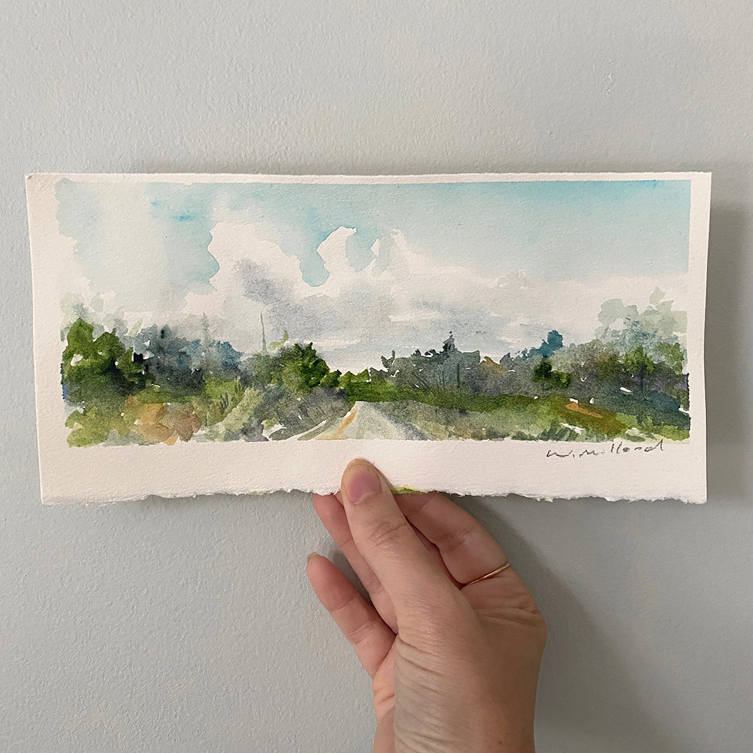 This original art is custom framed in a white float mount approximately 16” x 9”. Art is on handmade cold-press watercolour paper with a deckled edge. Art is approximately 9" x 4.25". Art will be signed on the front. Also signed and dated on the back with pencil upon purchase.